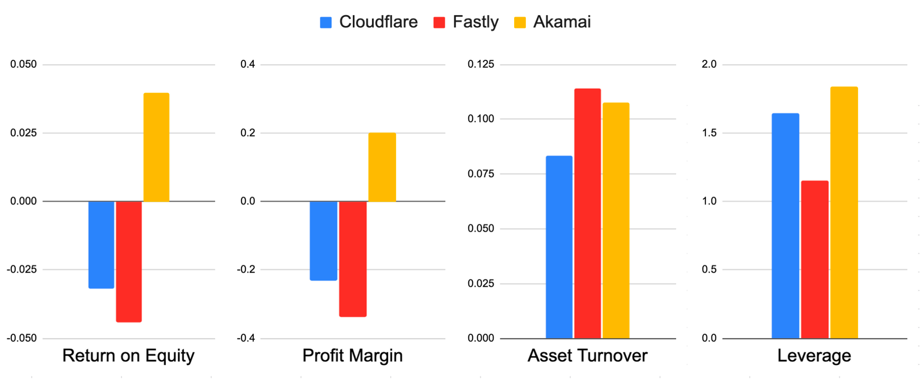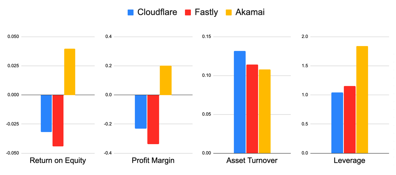 The profit margin for Akamai stands out as the only positive one, since they’re the only profitable company of the bunch. Cloudflare and Akamai both have a higher degree of leverage because they’ve both raised money by issuing convertible debt, while Fastly only has minor obligations like unpaid invoices and wages.