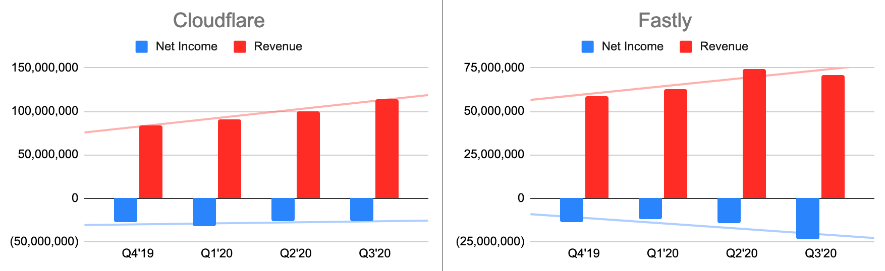 It’s also worth pointing out that between the two unprofitable companies, Cloudflare is more profitable than Fastly, and you can see Cloudflare’s net loss decreasing as revenue increases while Fastly’s net loss is increasing with revenue: